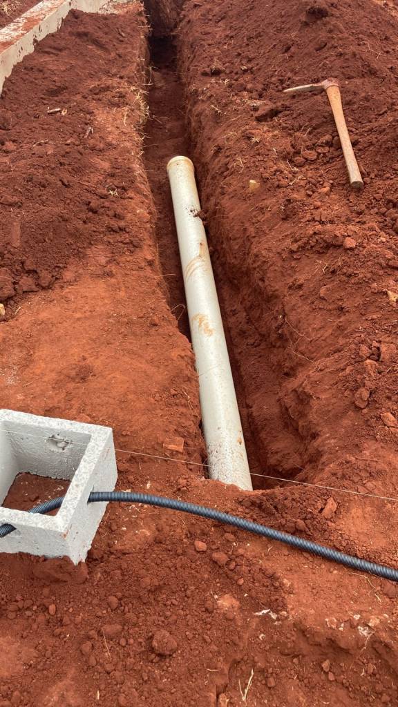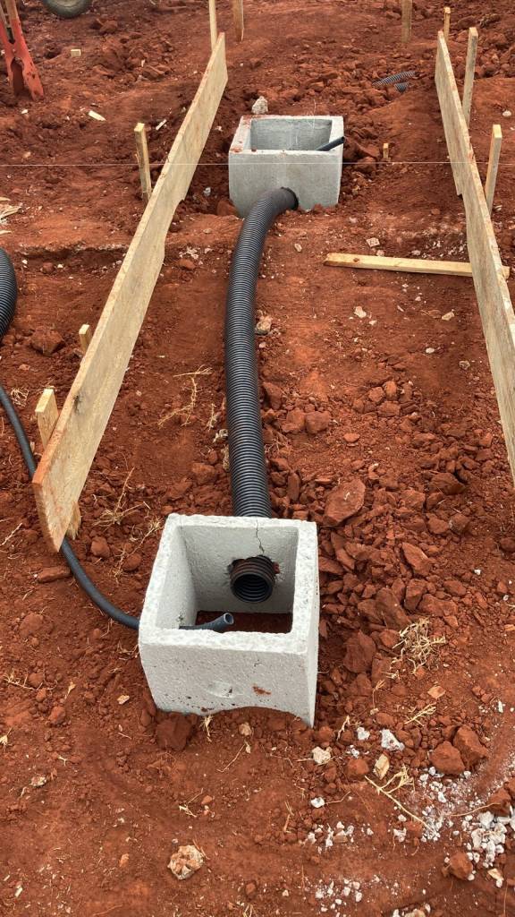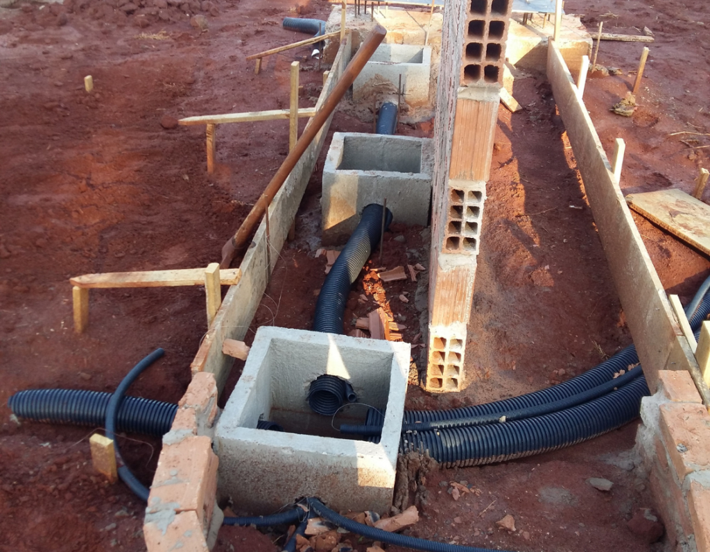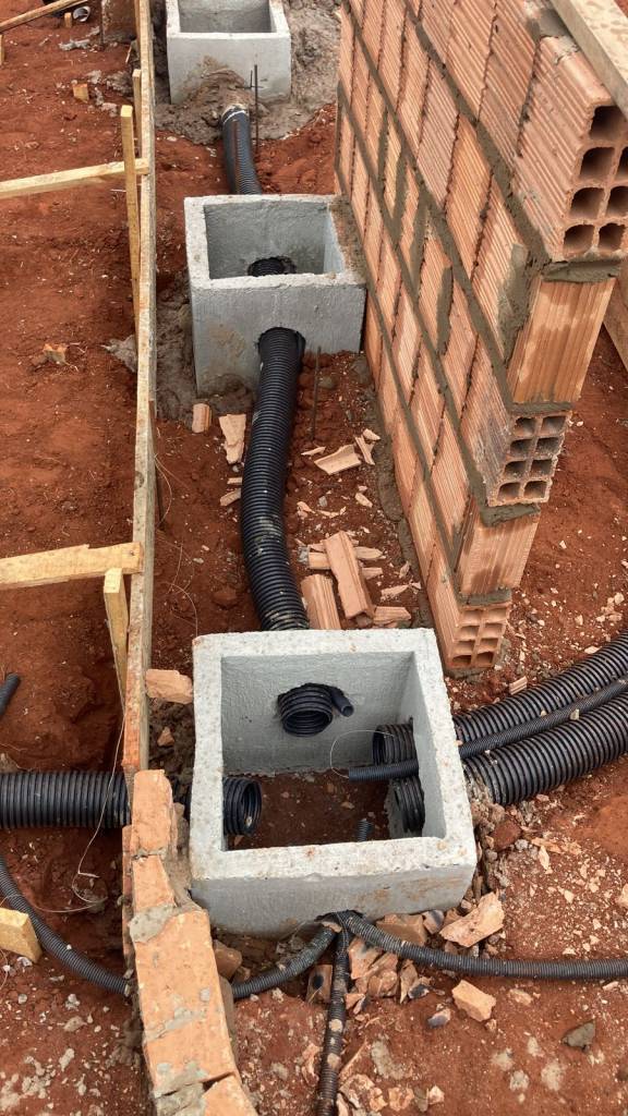 As instalações das caixas de passagem, dos eletrodutos e dos canos de PVC é a próxima etapa, foi iniciada no dia 17 de junho de 2022. Com as informações detalhadas do projeto de instalações elétrica, o primeiro passo diz respeito a locação das caixas de passagem para a instalação dos eletrodutos durante todo terreno.